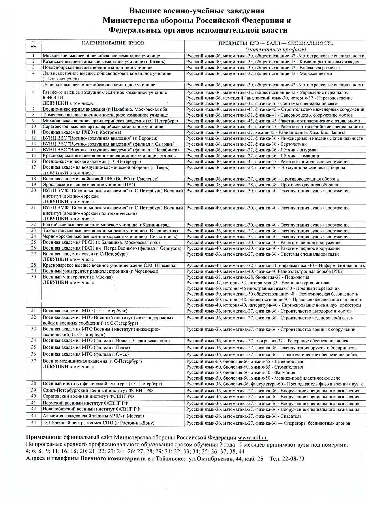 Военный комиссариат Тобольского района информирует вас о начале отбора кандидатов для поступления в высшие военно-учебные заведения Министерства обороны Российской Федерации и других силовых ведомств.
